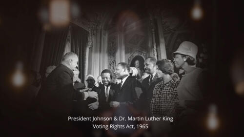 Newsreel footage of President Johnson signing the Voting Rights Bill.